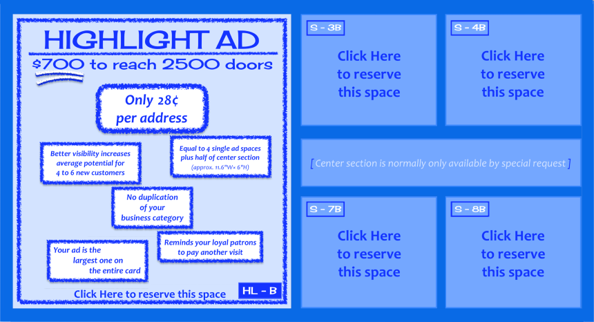 Every month we reach 2500 local area households with large 6.5″ H x 12″ W color postcards that are delivered by USPS.