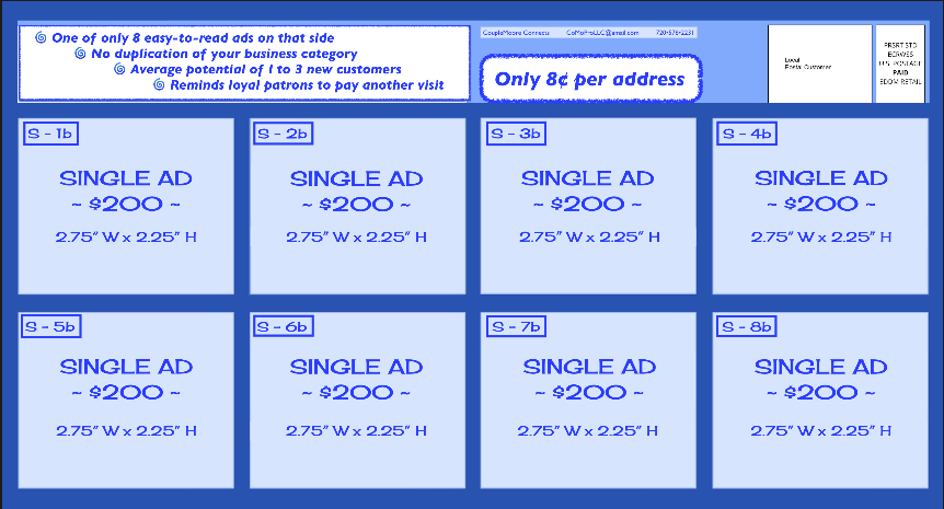 Your ad is printed on our shared community postcards and distributed to targeted households, ensuring maximum exposure to your ideal customers.